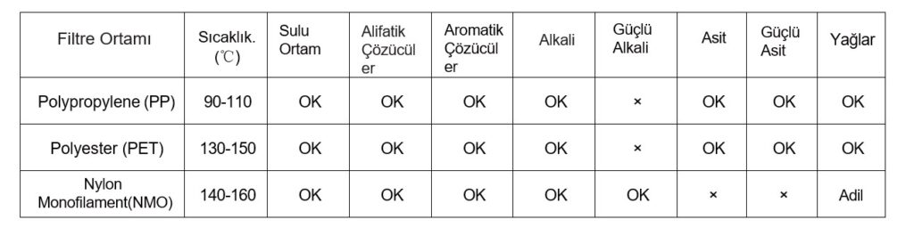 Filtre Ortamı Kimyasal Uyumluluk Tablosu